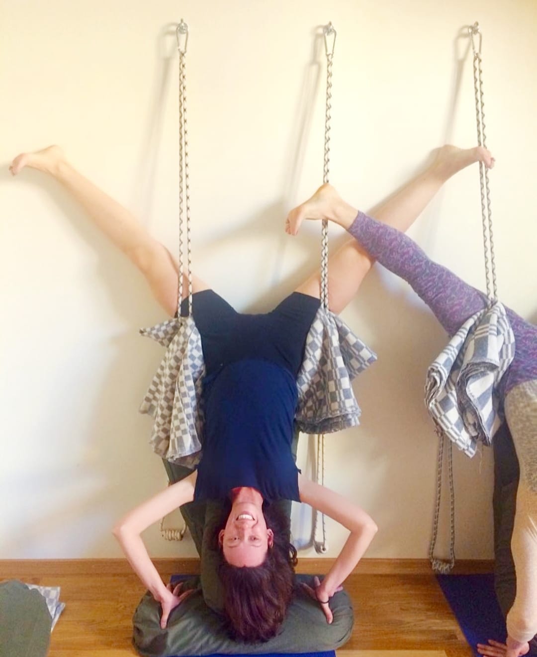 Для ускоренного процесса регенерации тканей, усиления положительного эффекта женщина или мужчина может использовать прочные ленты и веревки, которые крепятся к потолку или стене. На них нужно повиснуть вниз головой, соединив ступни между собой. Это пассивная форма упражнения, которая позволяет получить глубокий релакс, так как не требует активного участия мышц тела. Происходит устранение очагов скрытой напряженности.