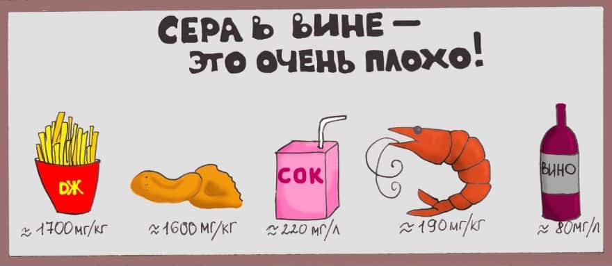 Содержание серы в вине по сравнению с различными продуктами На степень утреннего похмелья после употребления вина частично влияет и сернистый ангидрид. Продукты распада алкоголя токсины, а добавки в виде Е220, негативно сказываются на работе печени.