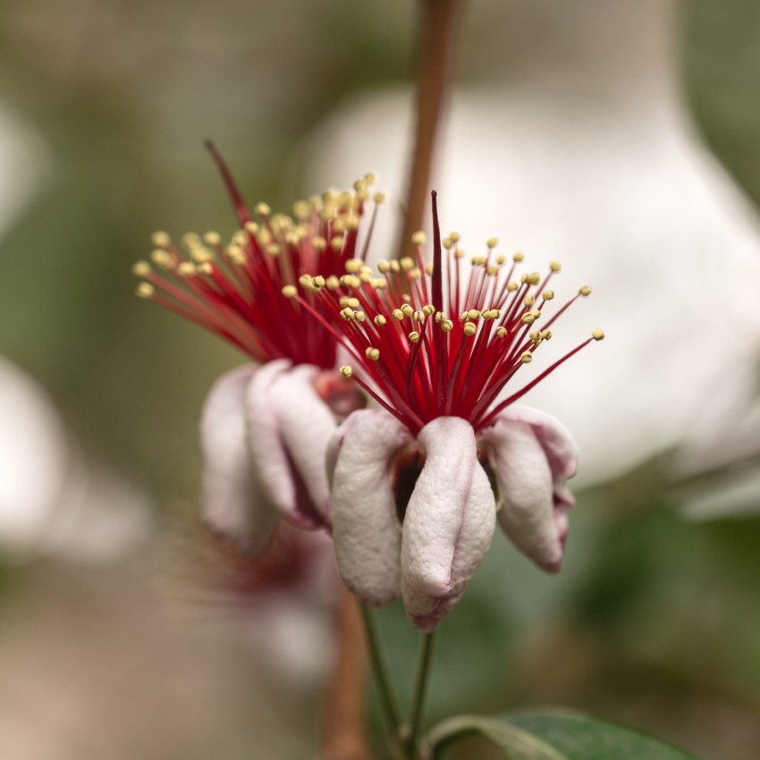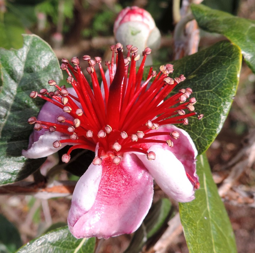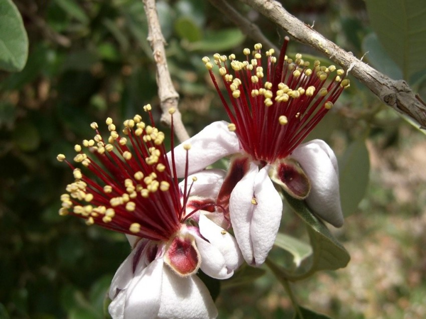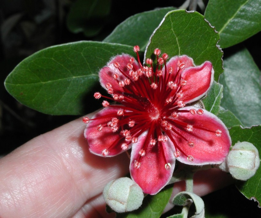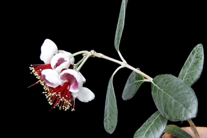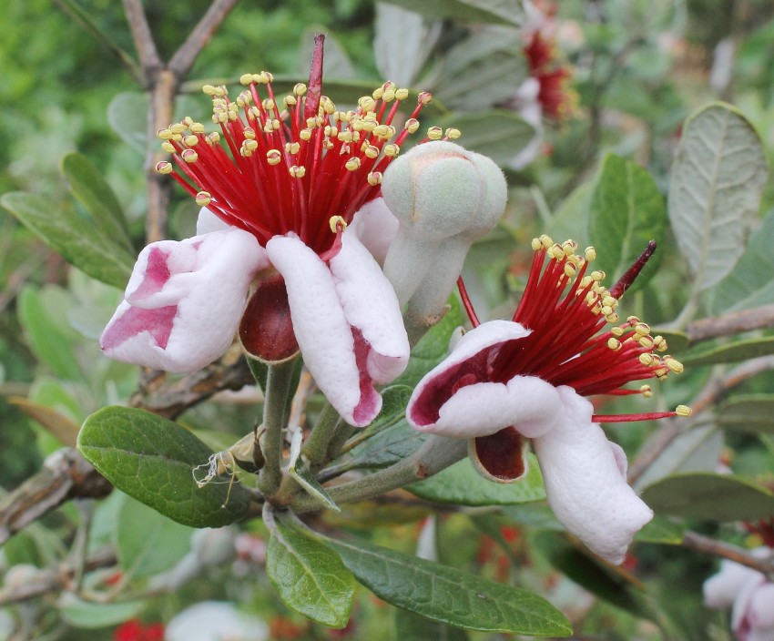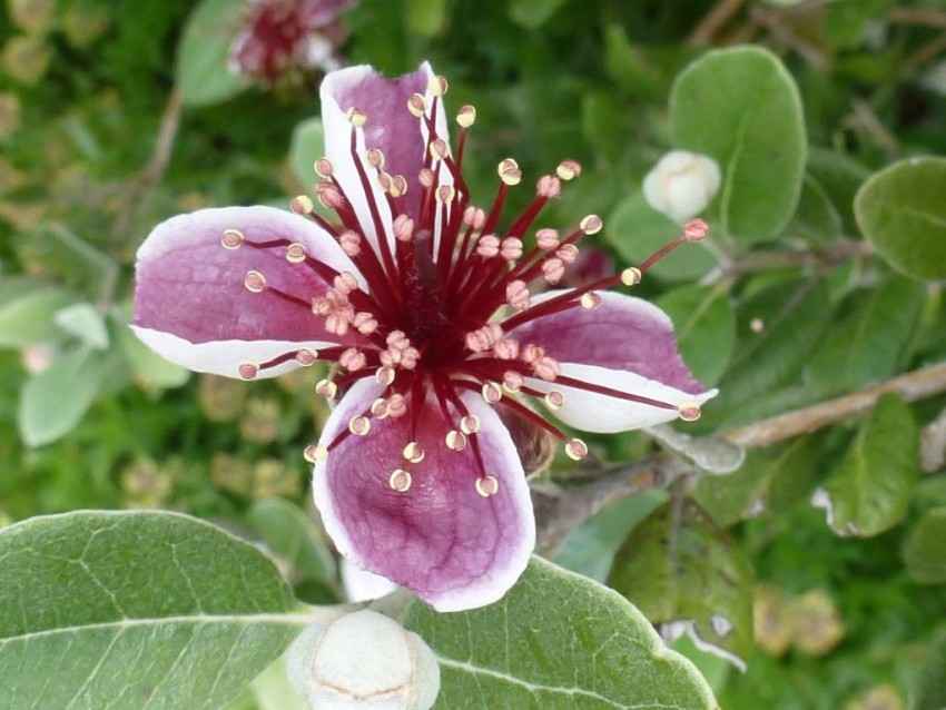 Почему многие садоводы предпочитают выращивать фейхоа в открытом грунте в саду? Потому что растение это красиво цветет. Сверху цветы растения белые, а внутри малиновые. Особенно выделяются длинные тычинки. В открытом грунте цветение растения наблюдается весь июнь.