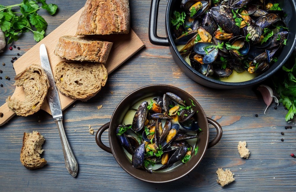 Готовится с добавлением белого вина, сливочного масла, чеснока и зелени. Это быстрое блюдо во многих странах считается настоящим изыском. Попробовать «Муль мариньер» с различными соусами можно в сети ресторанов «Leon».