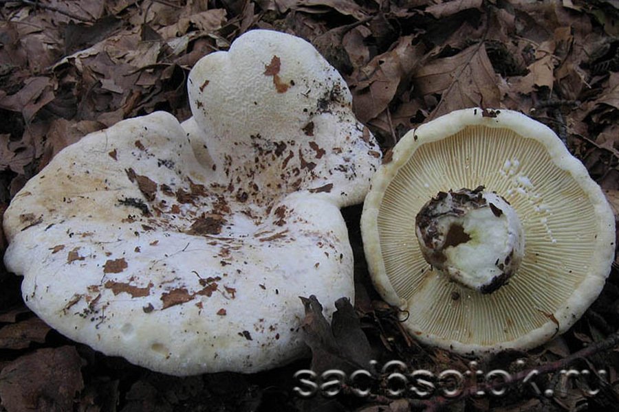 - Груздь настоящий. Шляпка крупная, у молодых представителей вида почти плоская или округло-выпуклая, с возрастом становится воронковидной, очень слизкая. У зрелого гриба края мохнатые, завернутые вниз с водянистыми кольцевыми зонами. Диаметр шляпки достигает 10-20 сантиметров. Цвет изменяется со временем: от белого до слабо-желтоватого. Мякоть гриба упругая, мясистая, плотная. Млечный сок горький и острый. Пластинки широкие, редкие, белые или кремовые, желтоватые по краям. Ножка крепкая, внутри полая, ровная до 5 сантиметров высоту.