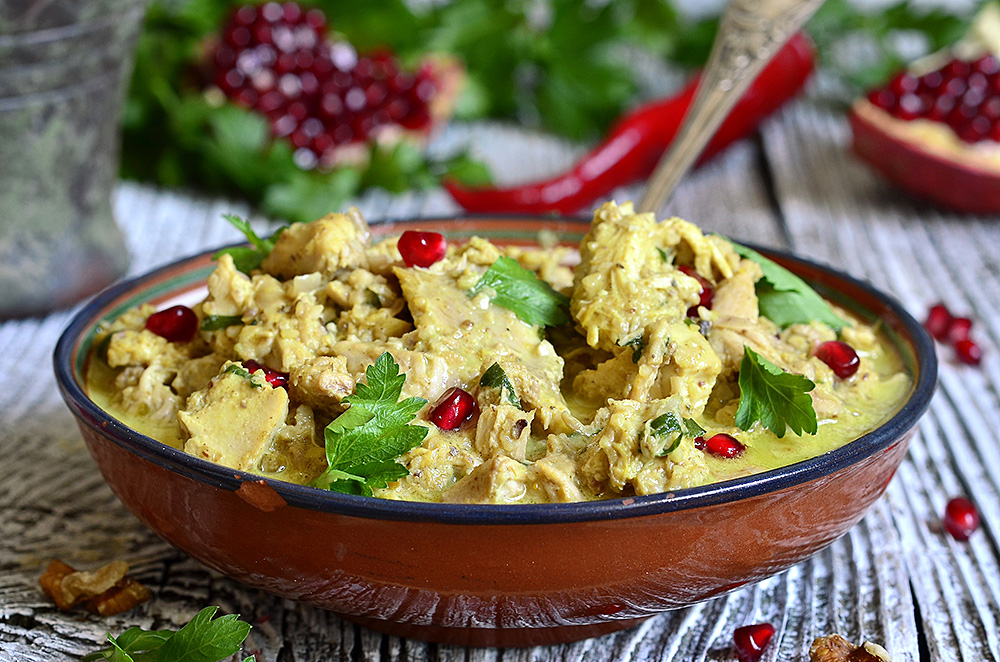 Еще одно рагу, загущенное ореховой пастой, сациви — это блюдо, обычно приготовленное из курицы или индейки, тушенных в пряном ореховом соусе и подаваемых холодными.