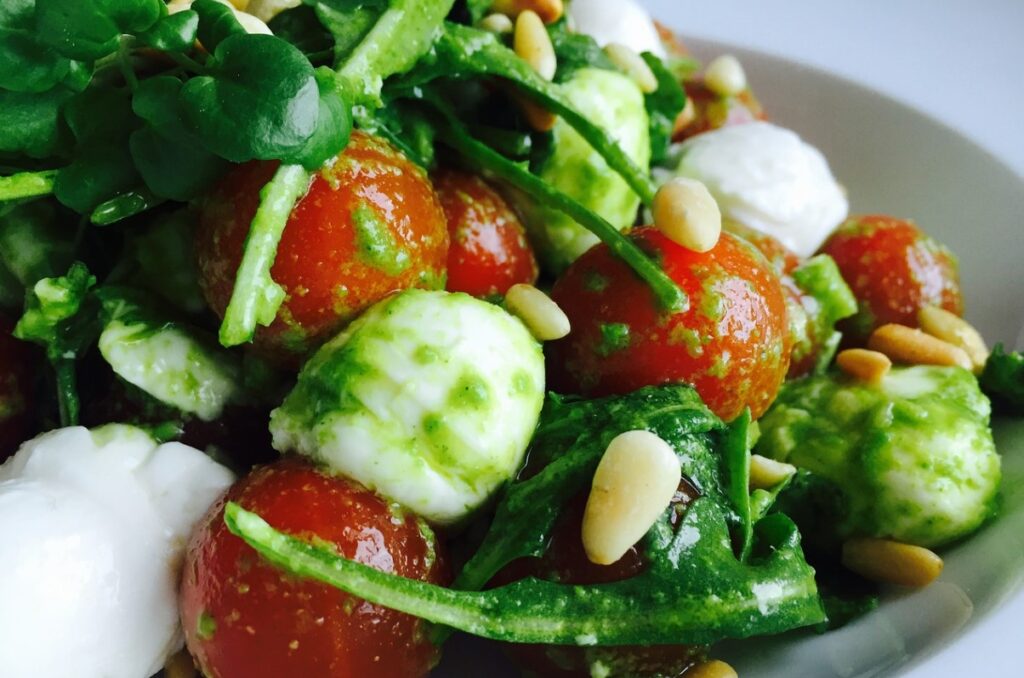Кедровые орехи (калорийность блюда составляет 414,73 ккал/100 г) отлично сочетаются с итальянским кисломолочным продуктом и красным овощем.