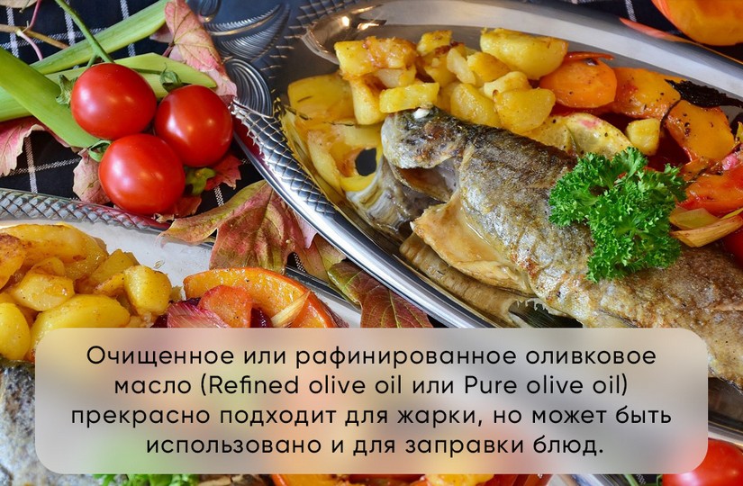 Рафинация — это процесс отбеливания, нейтрализации и дезодорации, после такой очистки от полезных свойств оливкового масла ничего не останется, не будет ни запаха, ни цвета, ни вкуса, ни пользы. Но жарить лучше именно на рафинированном масле (см. ниже о температуре дымления масел)