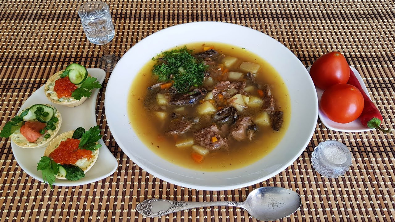 - Добавить мясо лося в суп. Поварить 10 минут.