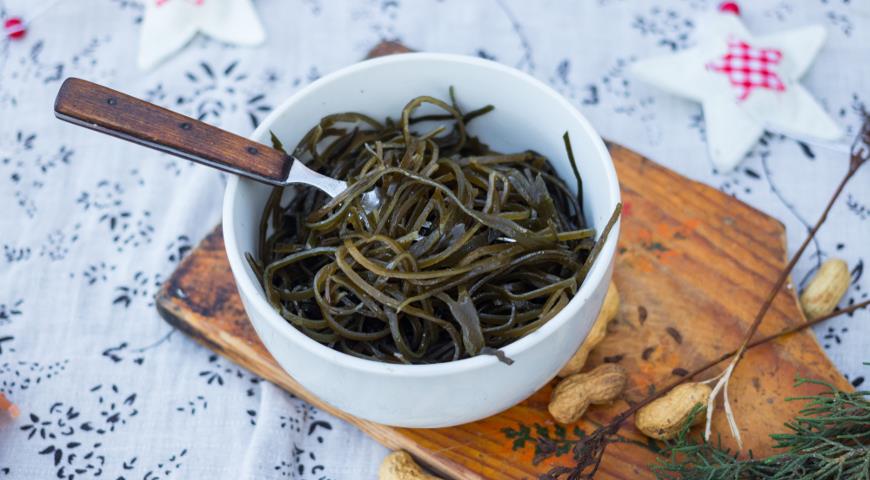 Готовую морскую капусту необходимо достать из маринада. Перед подачей ламинарии можно сбрызнуть растительным маслом. Маринованные ламинарии можно сочетать с морепродуктами, луком, грибами, морковью по-корейски и сельдереем.