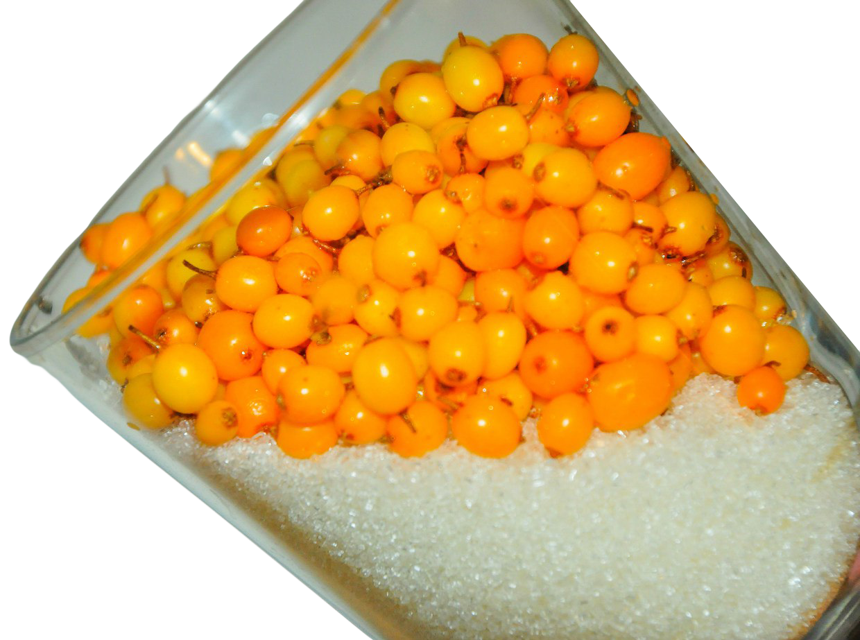 - Самый простой рецепт облепихи с сахаром на зиму – смешать ингредиенты в пропорции 1:1 и закупорить в банки. Сироп, образовавшийся при хранении — отличное средство при борьбе с инфекциями и бактериями, а ягоды можно использовать для выпечки, десертов, добавлять в различные чаи из облепихи и просто есть ложкой. Но, это не единственный способ заготовить солнечные плоды.