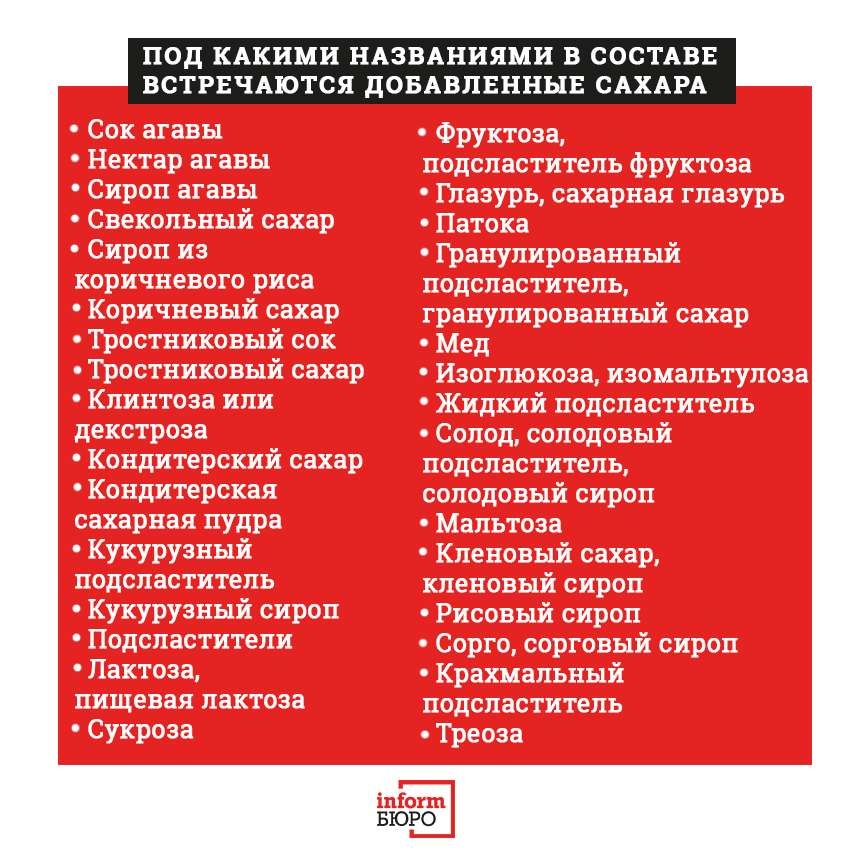 Проблема заключается в том, что отследить потребление сахара стало сложно. Во многие продукты компании добавляют сахар и сахарозаменители. Видов и названий добавленных видов сахара много, поэтому их сложно заметить, даже если вы читаете состав. К таким сахарам относятся разные сиропы (кукурузный, кленовый, рисовый), подсластители типа мальтозы, лактозы, фруктозы, а также соки и мёд.