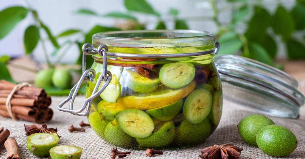 Для приготовления потребуется 20 штук зеленых орехов, а также 500 мл спирта крепостью 70%. Орехи необходимо порезать на дольки, залить спиртом в стеклянной емкости из темного материала, настаивать на протяжении 2 недели.