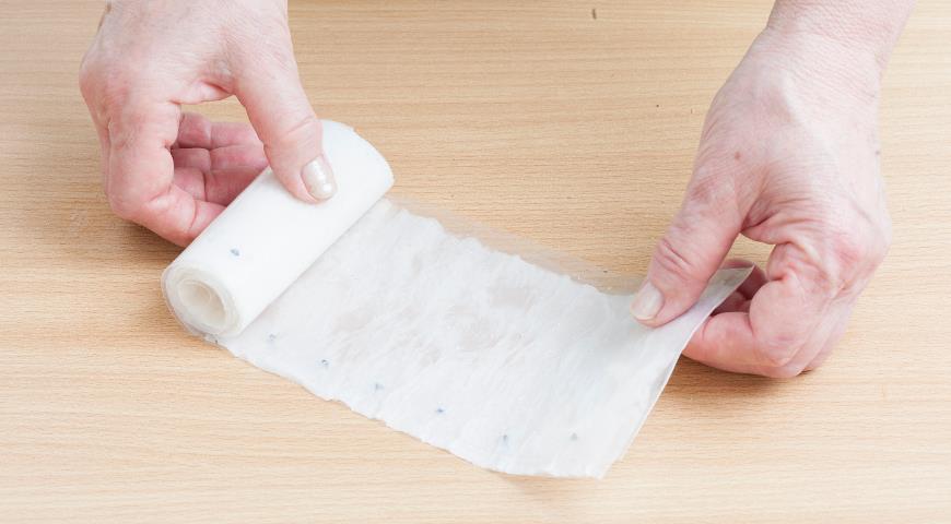 Сверху накройте слоем бумаги и полоской полиэтилена. Затем сверните в рулончик, закрепите резинкой и пометьте название культуры, если вы собираетесь высеять их несколько.