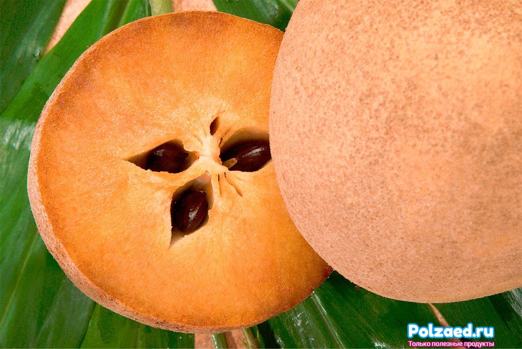 Во время путешествий в экзотические страны туристы часто оставляют плоды саподиллы без внимания из-за их невзрачного вида. По размеру фрукты напоминают сливу, а по виду — молодую картошку или киви без ворсинок, поэтому плод часто называют «тайским киви». Цвет кожуры коричневый или светло-бежевый, у неспелых фруктов — зеленоватый. Мякоть может быть желтой или чуть розоватой. Она мягкая и сочная, с небольшими зернистыми вкраплениями и волокнами, как у груши или хурмы. Внутри находятся некрупные семена — не более 3-5 штук. Они не пригодны для еды, и проглатывать их не стоит из-за небольшого острого крючка с одной стороны, который может оцарапать пищевод или кишечник.