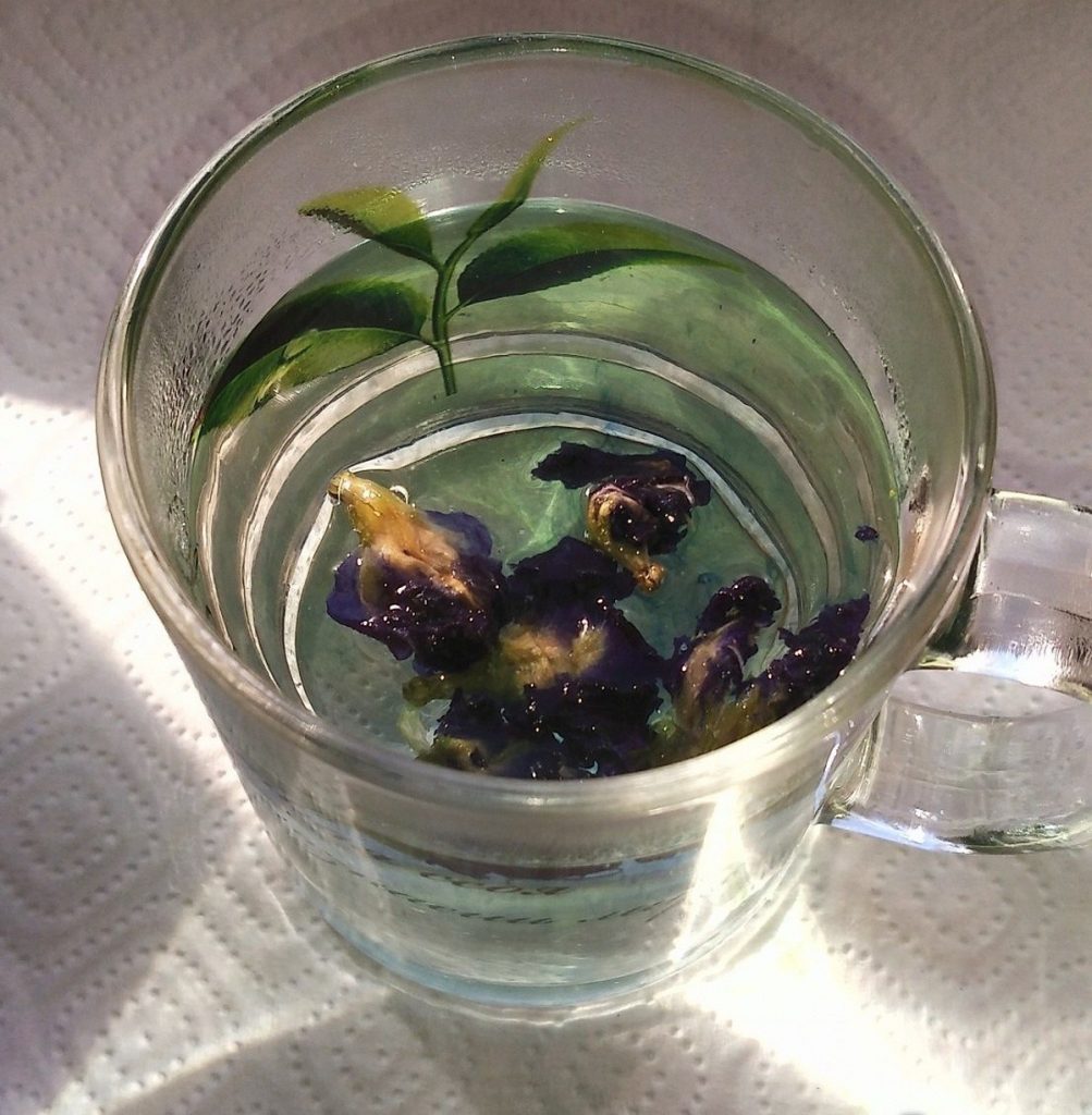 Также можно экспериментировать со вкусом и цветом “butterfly pea tea”. Добавьте всего пару капель лимонного сока в синий чай, и он приобретет новые вкусовые и цветовые оттенки.