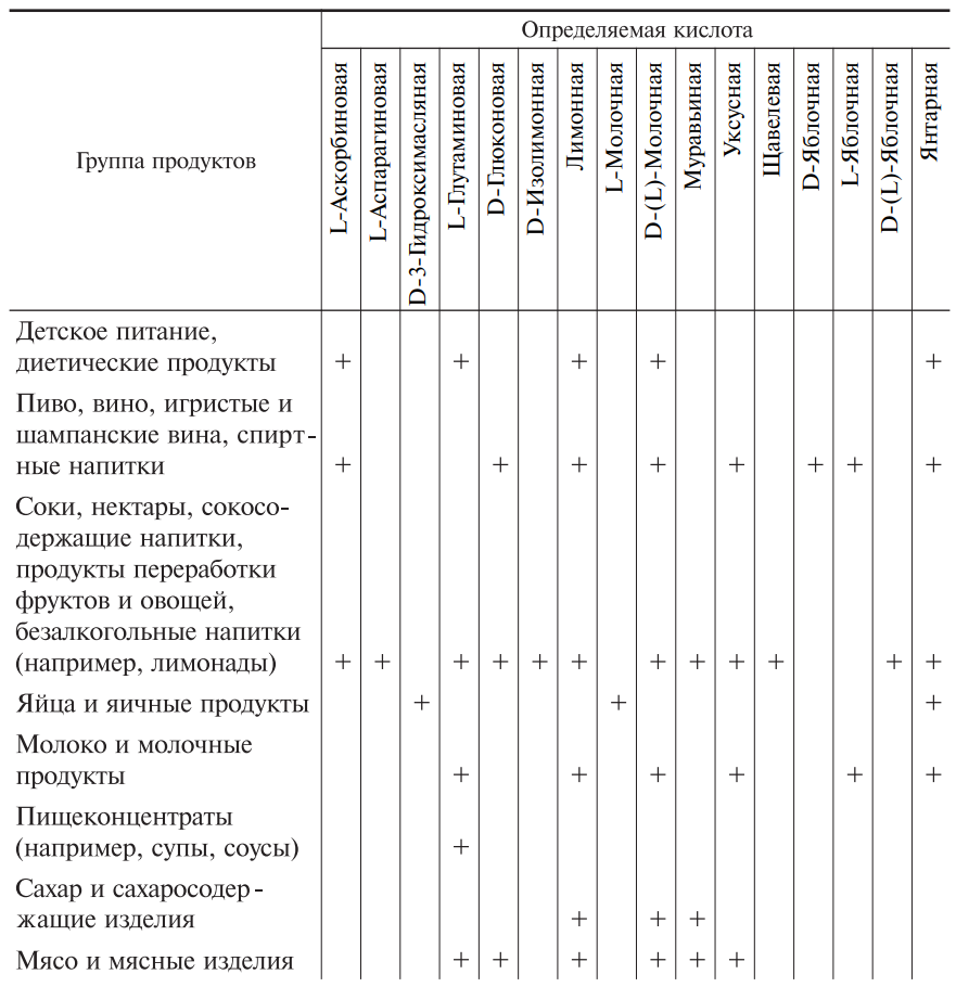 Перечень органических кислот в составе пищевых продуктов, определяемых ферментативными методами, представлен в табл. 4.