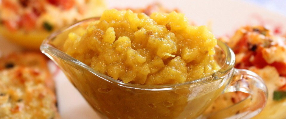 Для приготовления индийского соуса нужно взять: 30 яблок с кисло-сладким вкусом средней величины, 60 г соли, 300 г тростникового сахара, 100 г репчатого лука и 10 г чеснока (1 зубок), 70 г имбиря в молотом состоянии, 15 г сухого перца чили, 25 г зерен горчицы, 100 г изюма и 900 мл уксуса.