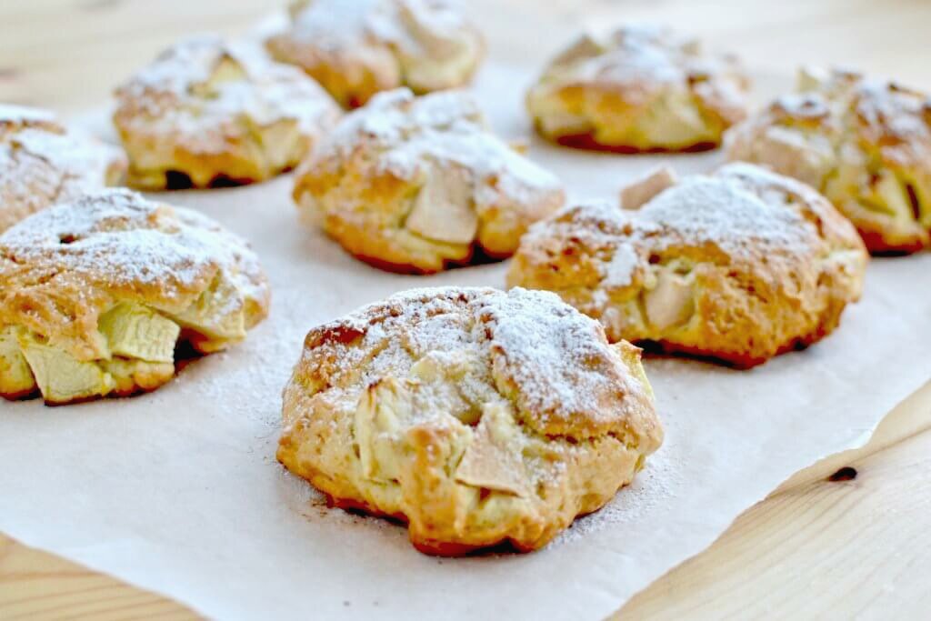 Яйца сбивают с солью и вводят ванильный сахар. Затем добавляют размягченное сливочное масло и продолжают взбивать. Постепенно добавляют муку, посыпанную разрыхлителем. Полученный состав перемешивают миксером. Нарезанные маленькими кубиками яблоки перемешивают с тестом с помощью лопатки. Смазанный маслом противень слегка засыпают мукой и выкладывают формированные из теста печенья на большом расстоянии. Выпекать нужно при температуре 180 градусов, 15 минут. Готовое печенье можно посыпать сахарной пудрой.