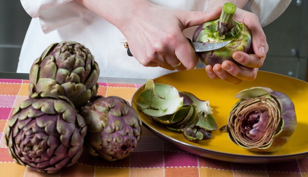 Готовить артишоки необходимо только в эмалированной посуде, иначе они почернеют. Ножом с острым лезвием отрезают все бурые или повреждённые листья.