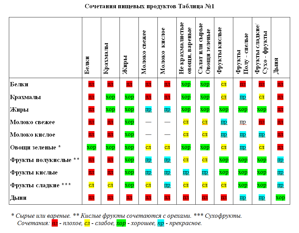 ОРИГИНАЛЬНАЯ ТАБЛИЦА СОЧЕТАНИЯ ПИЩЕВЫХ ПРОДУКТОВ ГЕРБЕРТА ШЕЛТОНА