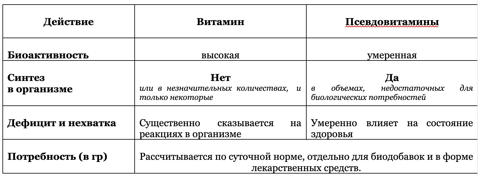 Все эти соединения, как и холин, в чем-то повторяют свойства полноценных витаминов, в то же время не являясь таковыми по ряду признаков, в том числе, по способности синтезироваться организмом. И вот в чем незначительная, но всё же разница между витаминоподобными веществами и признанными полноценными витаминами: