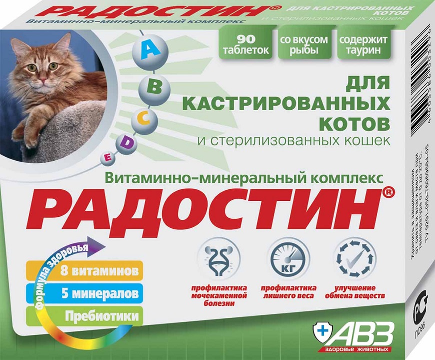 - Ветпрепарат “Радостин” содержит все необходимые витамины и минералы для поддержания здоровья животных, перенесших операцию кастрации или стерилизации.